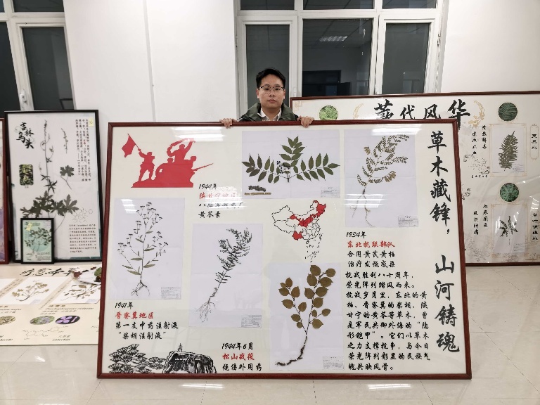 本作品以“草木藏锋,山河铸魂”为主题,精选北柴胡、关黄柏、黄芩、膜荚黄芪、虎杖五种抗战时期救治伤员的中草药标本,致敬抗战胜利八十周年。制作中创新采用“温度梯度烘干法”与“隔层压制工艺”,既保全了植物形态,又守护了历史记忆。这些曾在前线救死扶伤的草木,承载着医者仁心与民族智慧,以标本之形延续着不屈的精神火种,见证着中华大地的坚韧与荣光。
